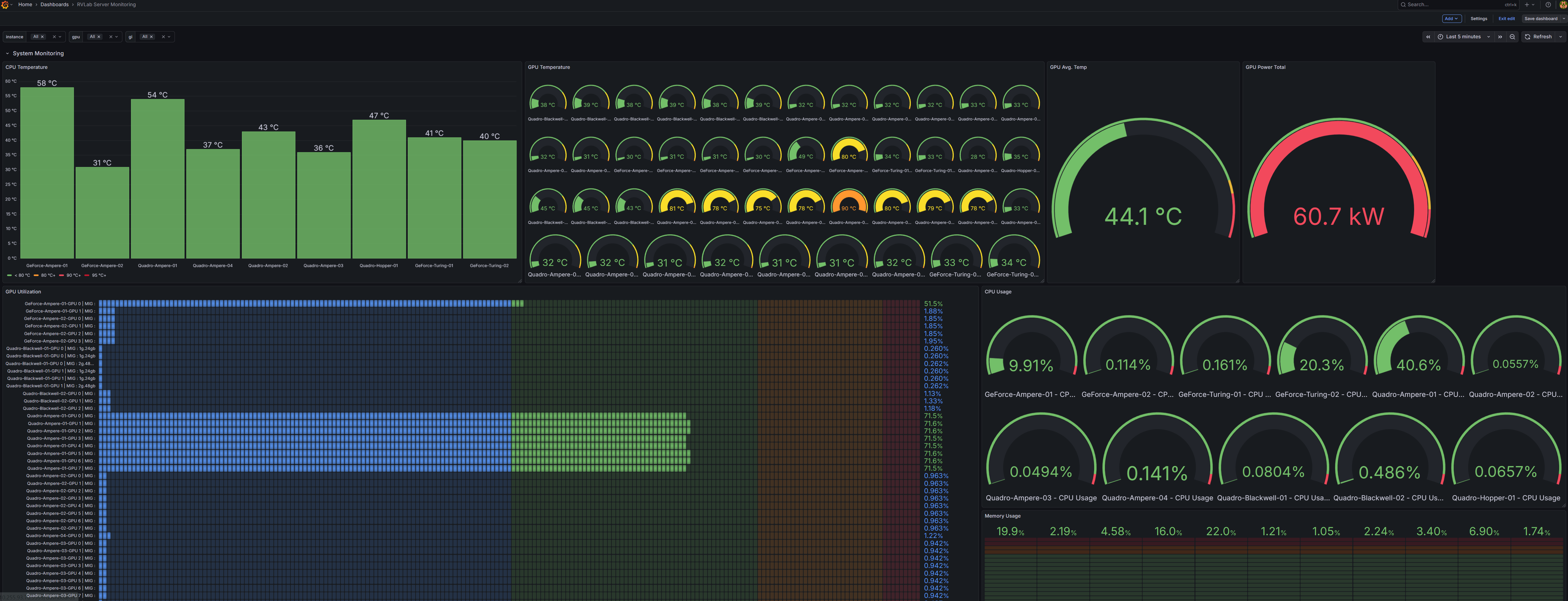 최근 교내 서버실에 에어컨이 고장나는 상황이 발생하였는데 연구실 GPU 등 과열이 발생할 경우 재성능을 발휘하지 못하거나 고장이 날 수 있는 등의 문제를 초래할 수 있어 다음과 같은 방법으로 연구실 내 있는 모든 워크스테이션의 상태를 모니터링 할 수 있도록 만들어 두었습니다. 물론 쿠버네티스나 슬럼과 같은 고도화 된 방법을 사용할 수 있지만 더 많은 시간을 허비하고 싶진 않아서 빠르고 쉽게 모니터링 환경을 구축해보실 분들은 다음 방법을 사용해보시길 추천드립니다.